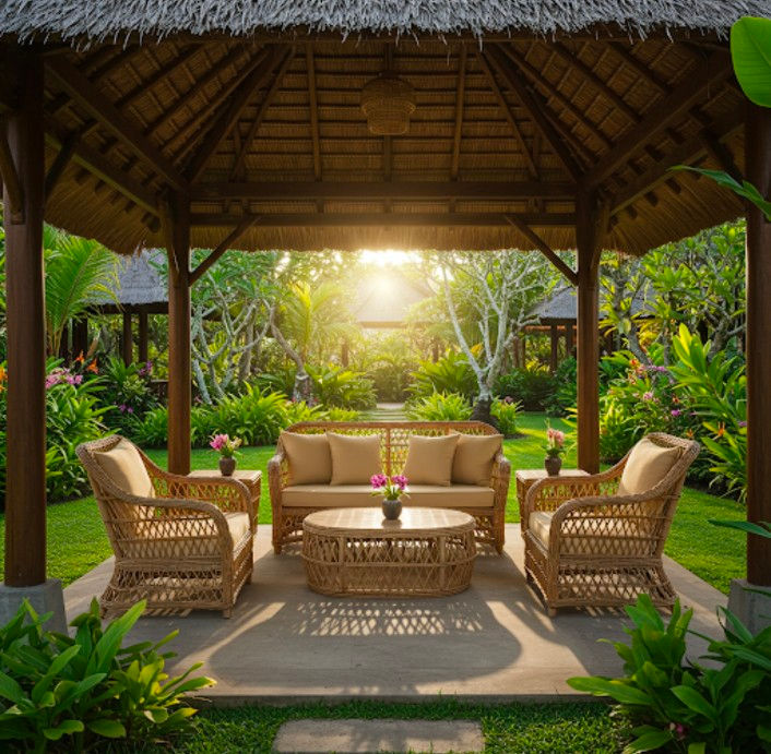 WATER RESISTANT, FADE RESISTANT, RECYCLABLE, OUTDOOR GRADE, UV STABILIZED, DUPLEX POWDER COATED, ZINC PRIMER, LIGHT WEIGHT, BRANDED FABRICS, FABRIC WARRANTY, ASIAN/MODERN/TROPICAL